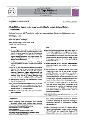 Results and Conclusion: Hot water was found to preserve the length of the larvae more accurately than cold vinegar and ethanol. Forensic medicine experts and crime scene teams should kill the larvae collected from a corpse for entomological examination using hot water, dry them in paper towels and preserve them in 96% ethanol and then send them to a forensic entomologist.